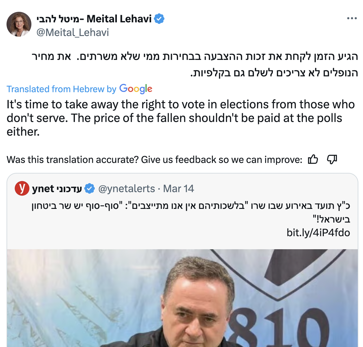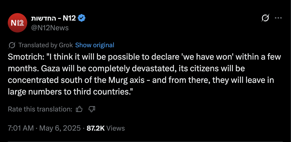 I’m interested in starving the Gazans and imposing a siege to the max. Whoever wants to leave will leave to a humanitarian zone that we will administer.