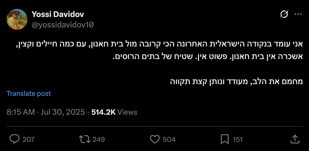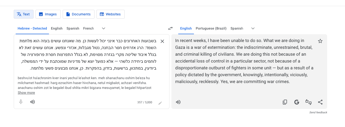 What we are doing in Gaza is a war of extermination: the indiscriminate, unrestrained, brutal, and criminal killing of civilians. We are doing this not because of an accidental loss of control in a particular sector, not because of a disproportionate outburst of fighters in some unit — but as a result of a policy dictated by the government, knowingly, intentionally, viciously, maliciously, recklessly. Yes, we are committing war crimes.
