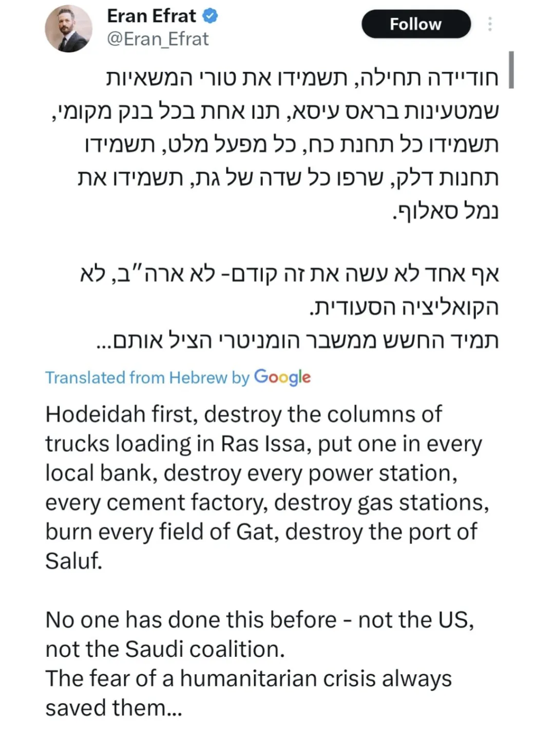 Hodeidah first, annihilate the convoys of trucks loading in Ras Issa, put one in every local bank, annihilate every power station, every cement factory, annihilate gas stations, burn every khat field, annihilate the Salif Port. No one has done this before - not the US, not the Saudi coalition. The fear of a humanitarian crisis always saved them...