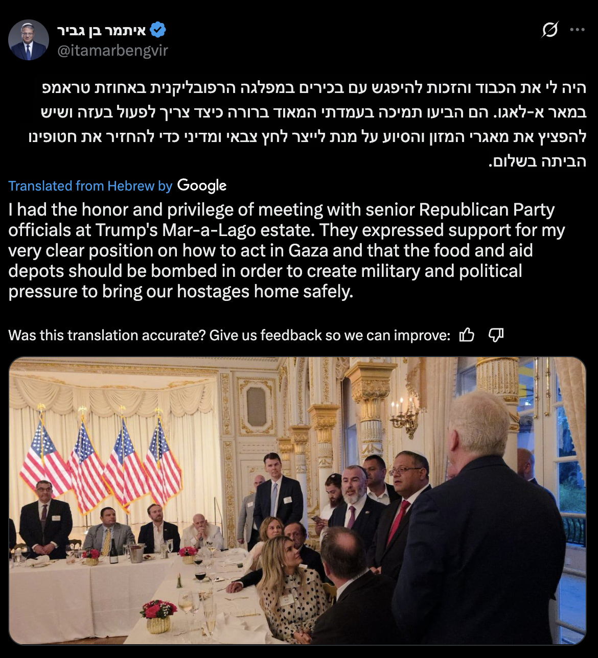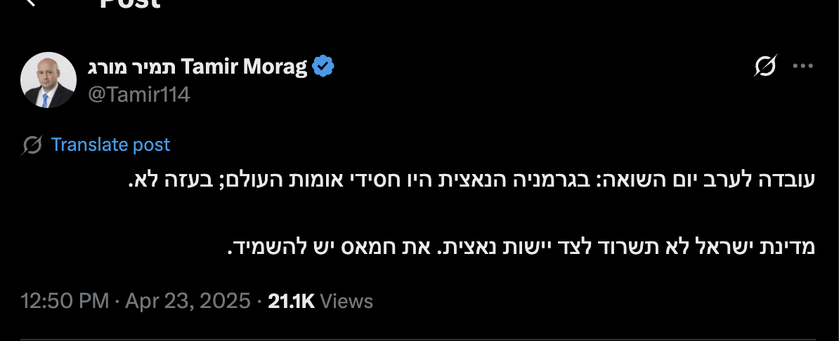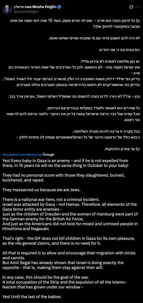 My tweet from more than four months ago reached foreign networks, in I declare and say that I unequivocally wish the terrorists in the Gaza Strip a holocaust, after what they did to us and our hostages, I do not apologize [...] Blood vengeance!