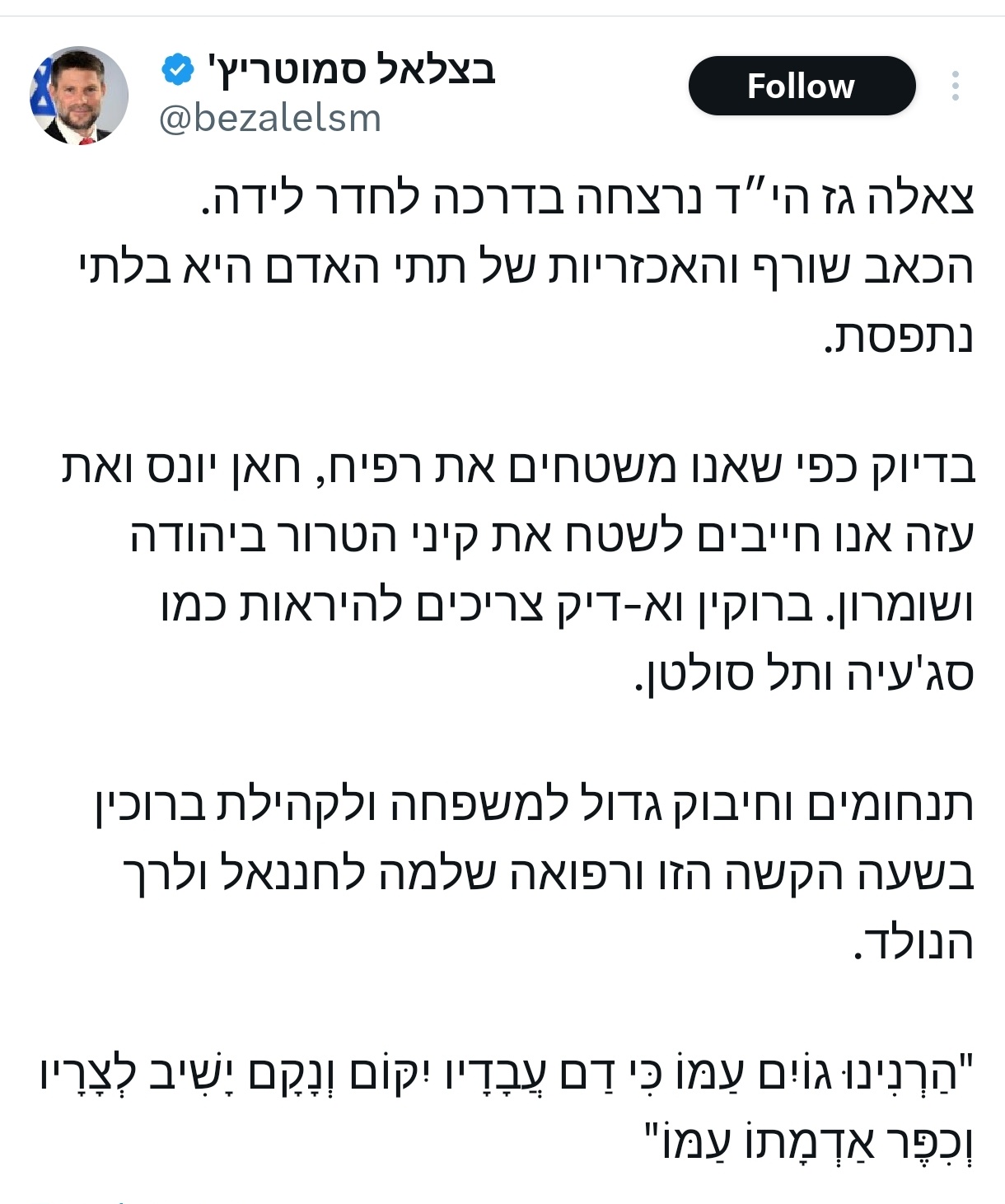 Just as we flatten Rafah, Khan Younis and Gaza, we must flatten the terror nests in Judea and Samaria. Bruqin and al-Dik should look like Shujaiya and Tel Sultan.