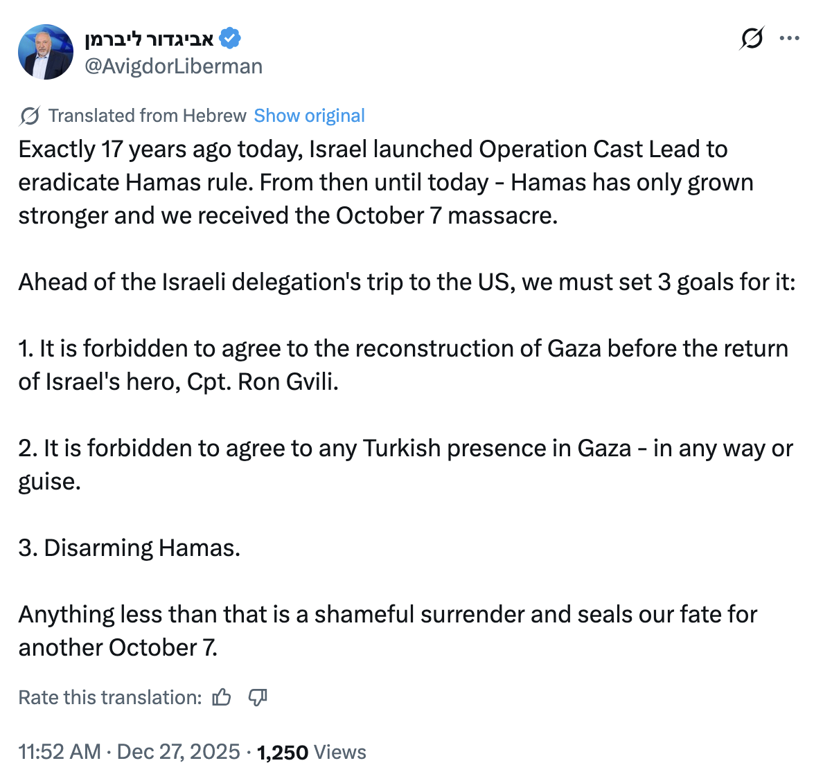 "The only way to achieve victory . . . is through the complete conquest of the Strip, a total cessation of "humanitarian" aid, and the encouragement of emigration."