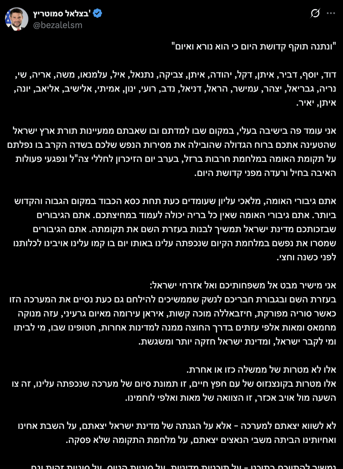 We will end this campaign when Syria is taken apart, Hezbollah is badly beaten, Iran is stripped nuclear threat, Gaza is cleansed of Hamas and hundreds of thousands of Gazans are on their way out to other countries, our hostages are returned to their homes or to burial among Israel, and the State of Israel is stronger and more prosperous.