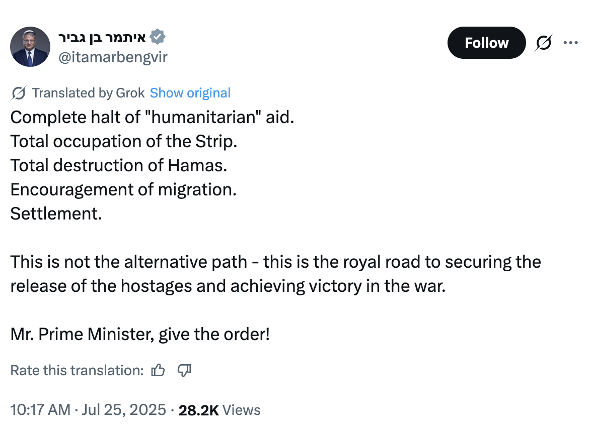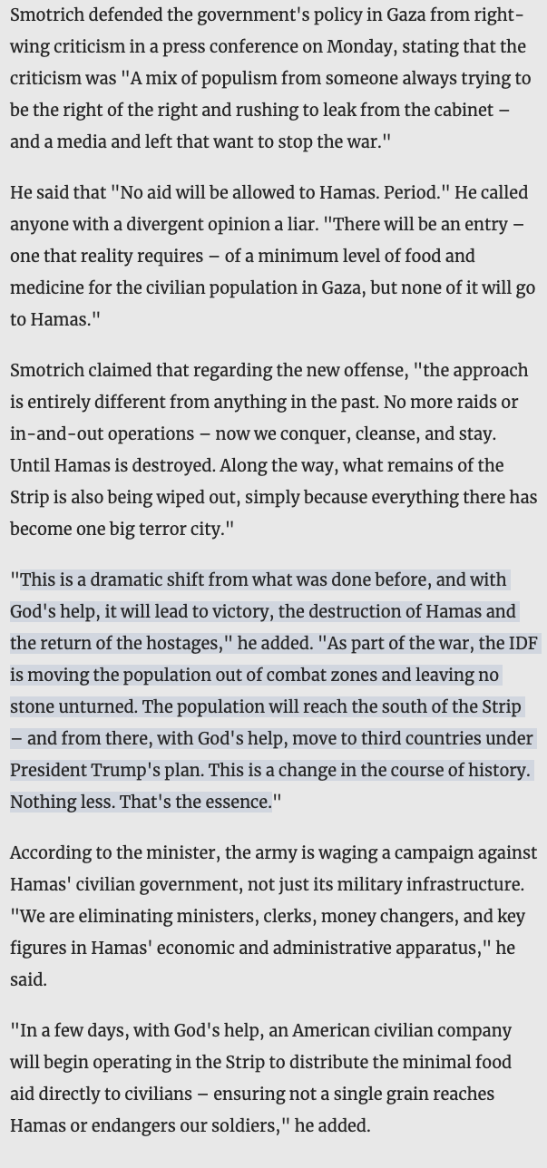 Complete halt of "humanitarian" aid. Total occupation of the Strip. Total destruction of Hamas. Encouragement of migration. Settlement.