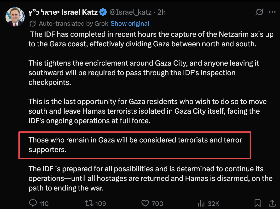 The IDF has completed in recent hours the capture of the Netzarim axis up to the Gaza coast, effectively bisecting Gaza between north and south. This tightens the siege around Gaza City, and anyone leaving it southward will be required to pass through the IDF's inspection checkpoints. This is the last opportunity for Gaza residents who wish to do so to move south and leave Hamas terrorists isolated in Gaza City itself, facing the IDF's ongoing operations at full force. Those who remain in Gaza will be terrorists and terror supporters. The IDF is prepared for all possibilities and is determined to continue its operations—until all hostages are returned and Hamas is disarmed, on the path to ending the war.
