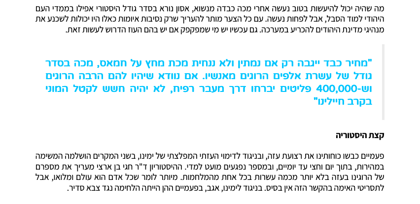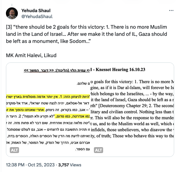 If we make sure that they will have many dead and that 400k refugees flee through the Rafah crossing, there will be no fear of mass slaughter among our soldiers [...] the IDF is acting now, which pushes the residents [...] into the cities. The immigration gates to Egypt and the sea should be opened. Allow people to go out and make it clear: whoever chooses to go out, has gone out.