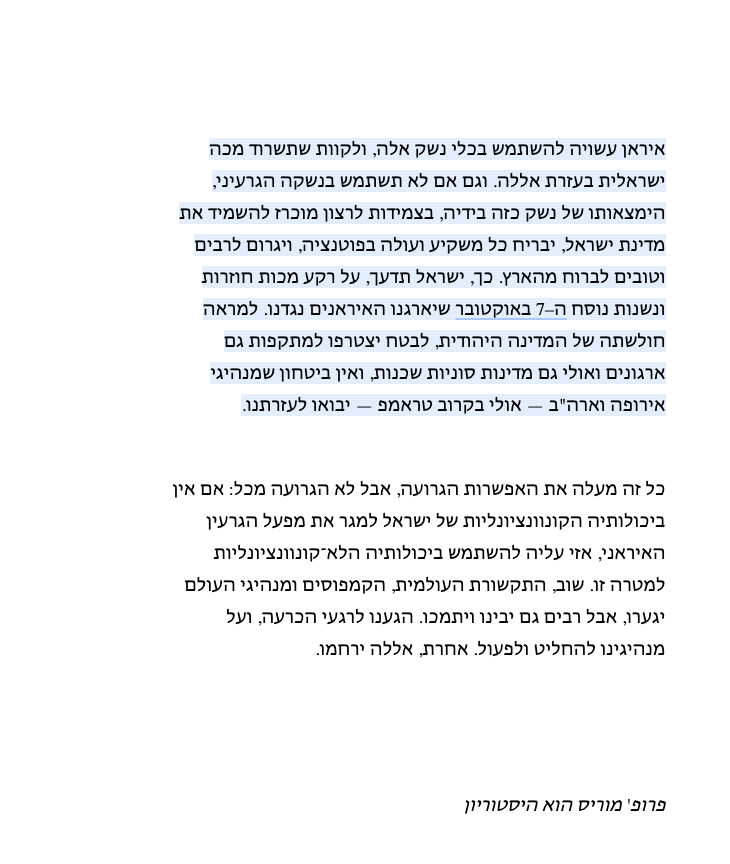 If Israel does not have conventional capabilities to destroy the Iranian nuclear plant, then it must use its nonconventional capabilities [nuclear weapons] for this purpose.