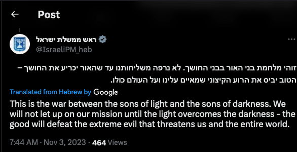 [T]his is the war between the sons of light and the sons of darkness. We will not let up on our mission until the light overcomes the darkness — the good will defeat the extreme evil that threatens us and the entire world.