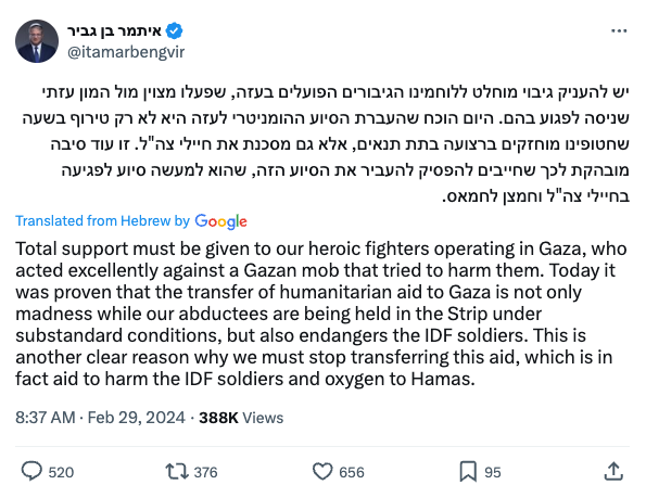 Today it was proven that the transfer of humanitarian aid to Gaza is not only madness while our abductees are being held in the Strip under substandard conditions, but also endangers the IDF soldiers. This is another clear reason why we must stop transferring this aid, which is in fact aid to harm the IDF soldiers and oxygen to Hamas.