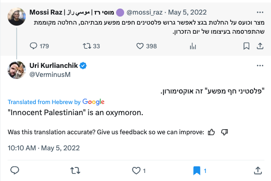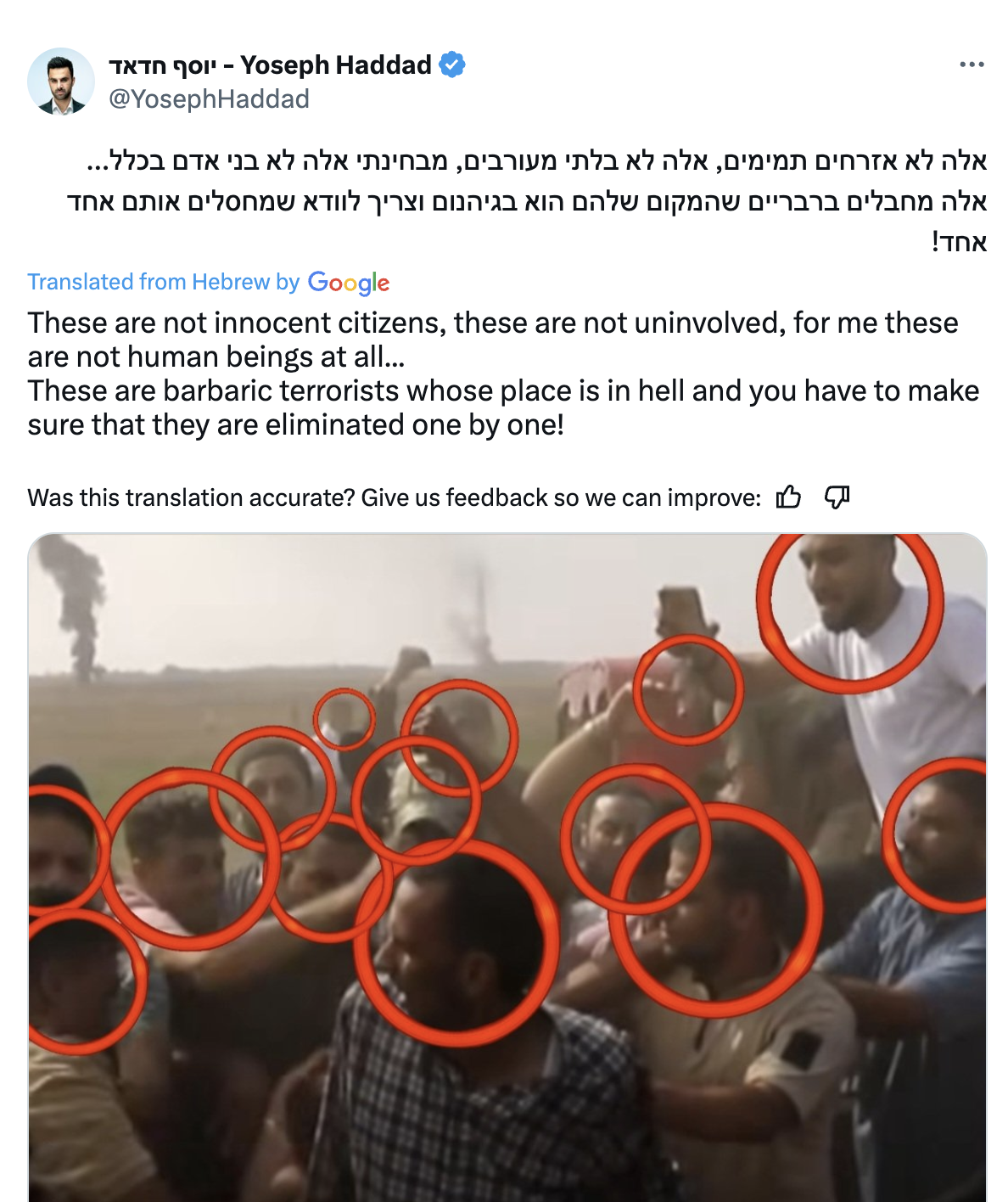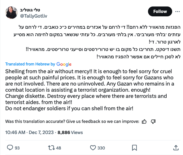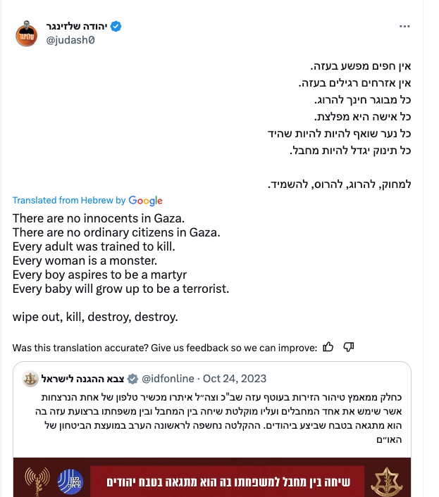There are no innocents in Gaza. There are no ordinary citizens in Gaza. Every adult was trained to kill. Every woman is a monster. Every boy aspires to be a martyr Every baby will grow up to be a terrorist. wipe out, kill, destroy, annihilate.