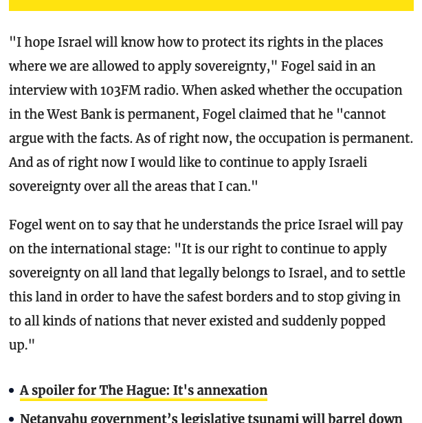 As of right now, the occupation is permanent. And as of right now I would like to continue to apply Israeli sovereignty over all the areas that I can ... It is our right to continue to apply sovereignty on all land that legally belongs to Israel, and to settle this land in order to have the safest borders and to stop giving in to all kinds of nations that never existed and suddenly popped up.
