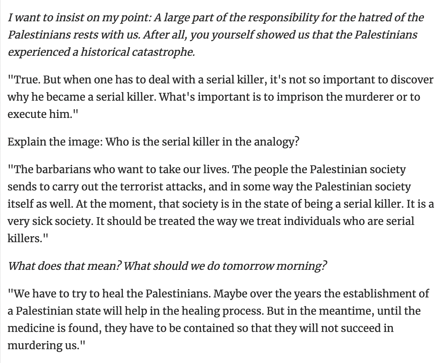 Something like a cage has to be built for them [Palestinians]. I know that sounds terrible. It is really cruel. But there is no choice. There is a wild animal there that has to be locked up in one way or another.