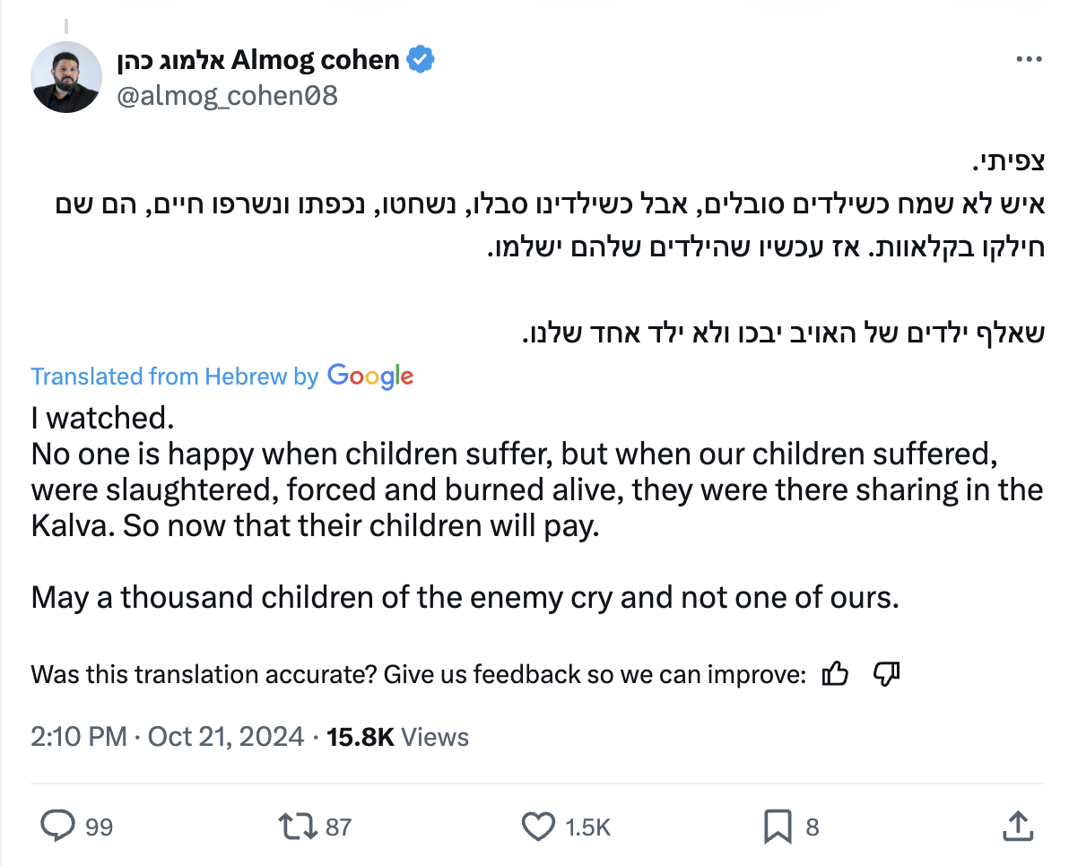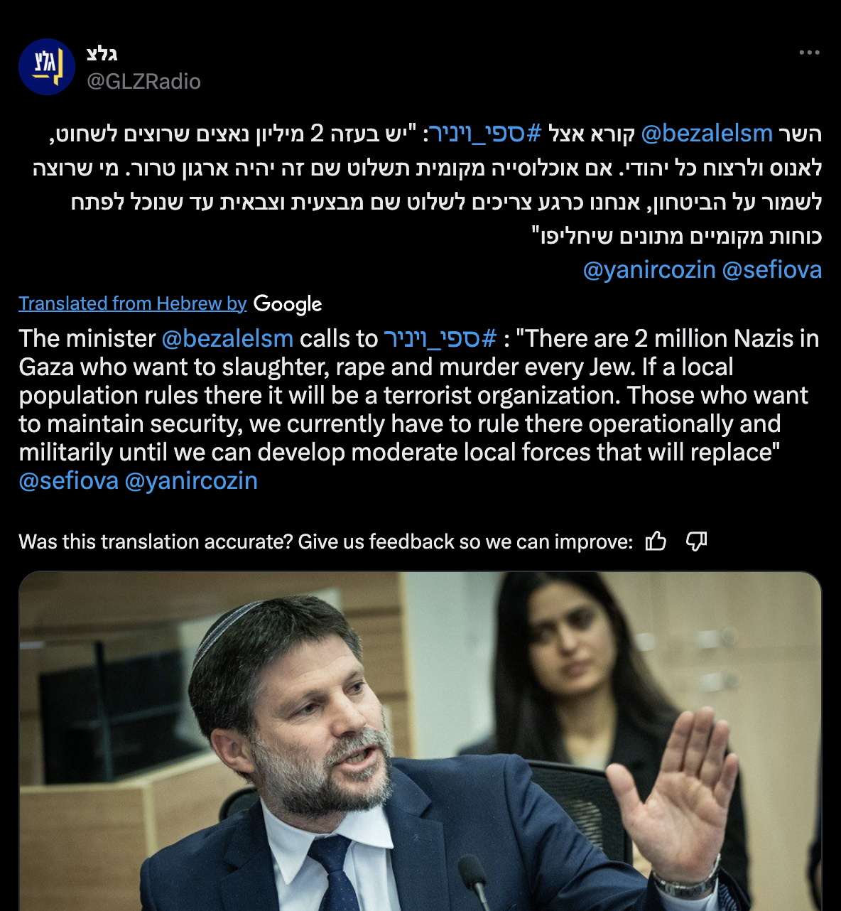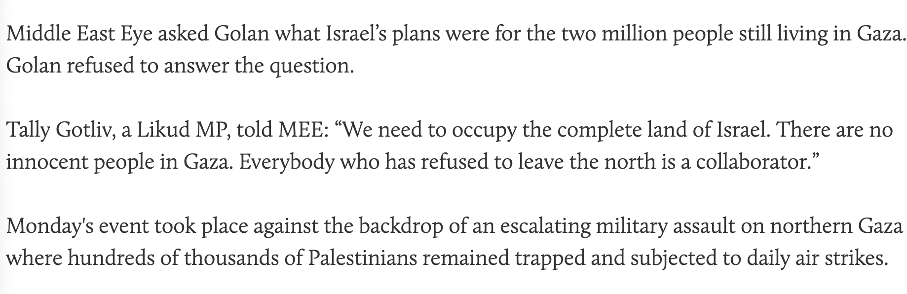 We need to occupy the complete land of Israel. There are no innocent people in Gaza. Everybody who has refused to leave the north is a collaborator.