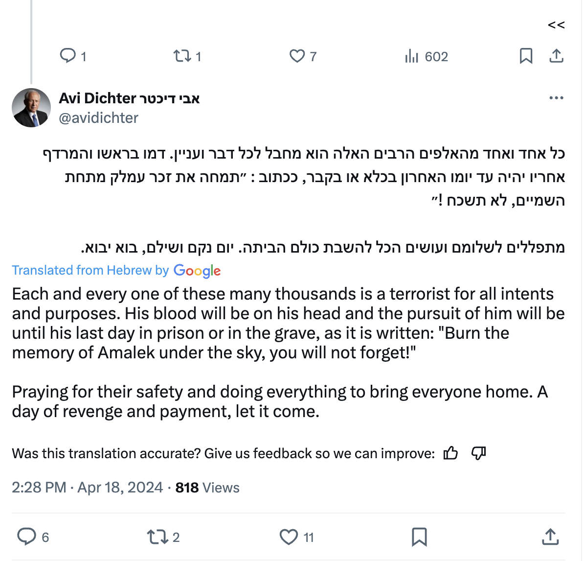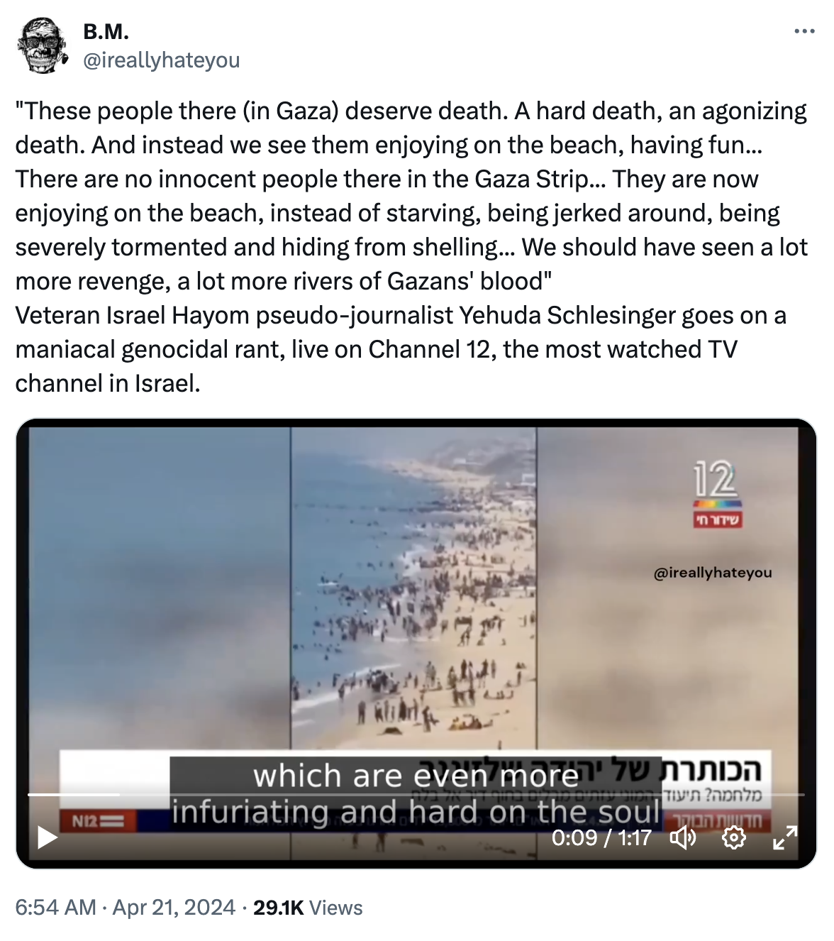 These people there [in Gaza] deserve death. A hard death, an agonizing death. And instead we see them enjoying on the beach, having fun... There are no innocent people there in the Gaza Strip... They are now enjoying on the beach, instead of starving, being jerked around, being severely tormented and hiding from shelling... We should have seen a lot more revenge, a lot more rivers of Gazans' blood