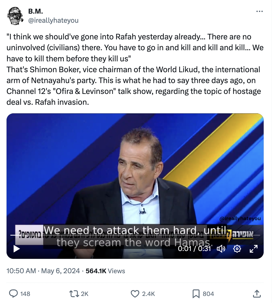 I think we should've gone into Rafah yesterday ... There are no uninvolved [civilians] there. You have to go in and kill and kill and kill ... We have to kill them before they kill us.