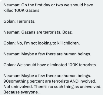 On the first day or two we should have killed 100,000 Gazans ... Maybe a few there are human beings. 90-something percent are terrorists and involved. Not uninvolved. There’s no such thing as uninvolved [civilians].