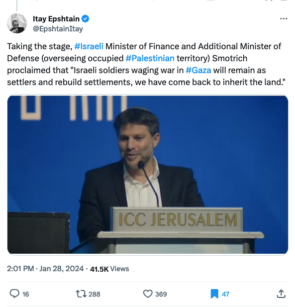 After we turn Khan Younis into a soccer field […] we need to take advantage of the destruction to tell the countries that each of them should take a quota, it can be 20K or 50K. We need all 2 million to leave. That's the solution for Gaza.