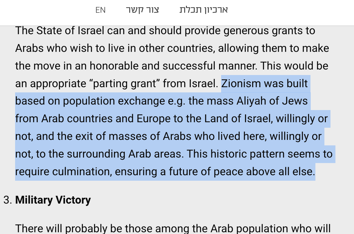 ...the transfer of [Palestinian] Arab population from the area of the Jewish state does not serve only one aim--to diminish the Arab population. It also serves a second, no less important, aim which is to advocate land presently held and cultivated by the [Palestinian] Arabs and thus to release it for Jewish inhabitants.