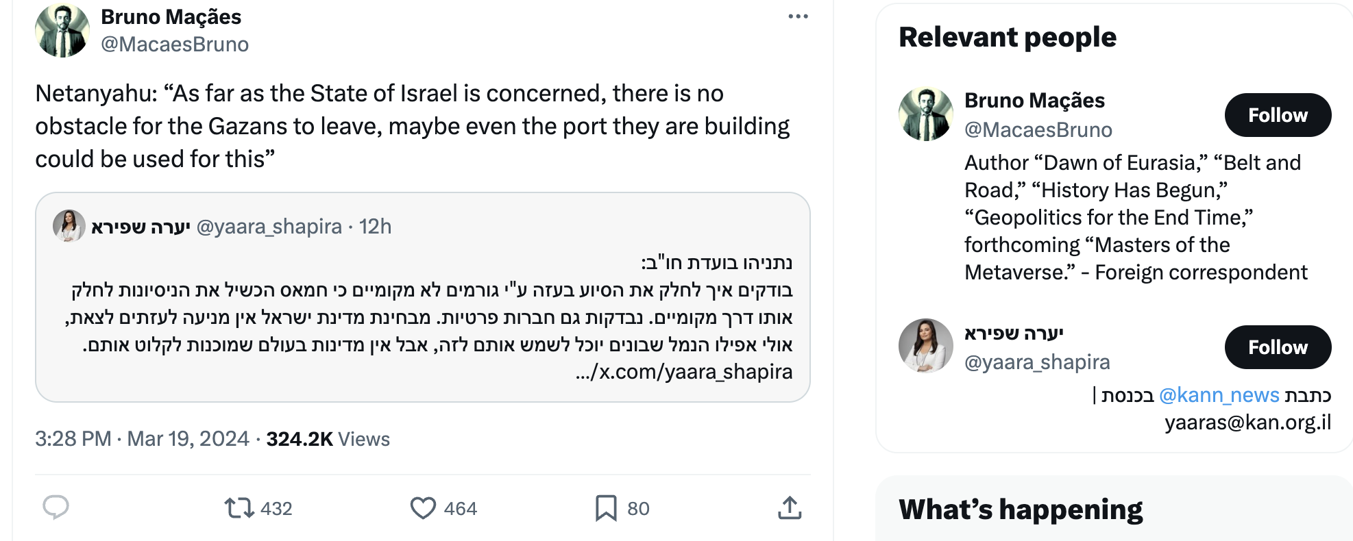 If we make sure that they will have many dead and that 400k refugees flee through the Rafah crossing, there will be no fear of mass slaughter among our soldiers [...] the IDF is acting now, which pushes the residents [...] into the cities. The immigration gates to Egypt and the sea should be opened. Allow people to go out and make it clear: whoever chooses to go out, has gone out.