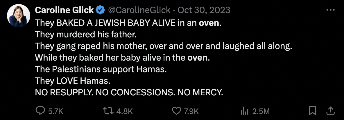 They BAKED A JEWISH BABY ALIVE in an oven. They murdered his father. They gang raped his mother, over and over and laughed all along. While they baked her baby alive in the oven. The Palestinians support Hamas. They LOVE Hamas. NO RESUPPLY. NO CONCESSIONS. NO MERCY.