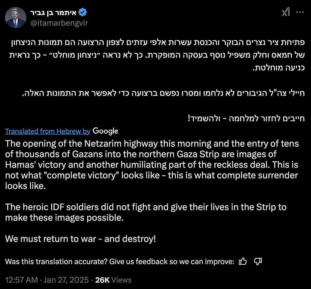 The opening of the Netzarim corridor this morning and the entry of tens of thousands of Gazans into the northern [Gaza] Strip are images Hamas' victory images and another humiliating part of the reckless deal. This is not what "complete victory" looks like - this is what complete surrender looks like. The heroic IDF soldiers didn’t fight and give their lives to allow these images. We must return to the war- and annihilate!